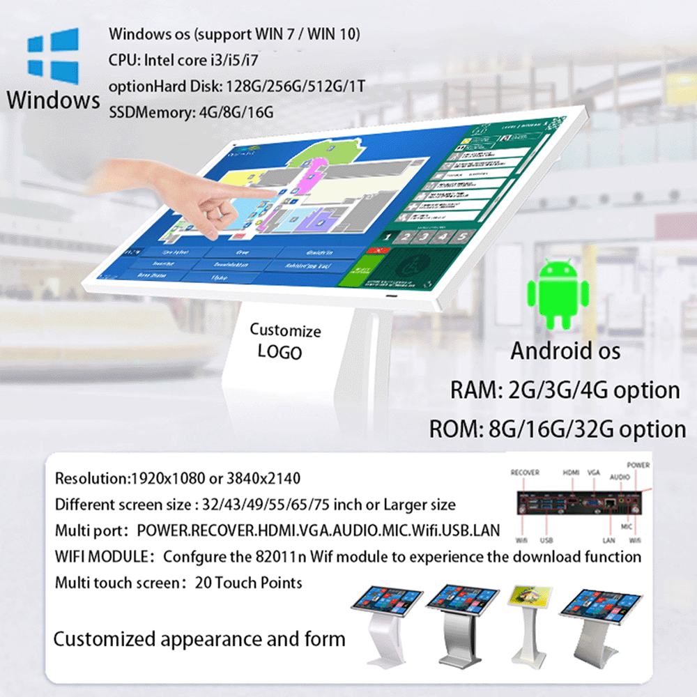 With a responsive touch panel, Android / Windows operating system, and durable metal enclosure, it enables efficient information delivery, advertising display, and user interaction.
